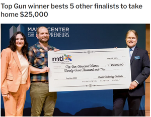 Nick Bergmann, center, co-owner of Peace House Studios in Bath, won top prize in the Top Gun pitch competition. He's joined by Tom Rainey, executive director of the Maine Center for Entrepreneurs. and Top Gun Program Manger Laurie Johnson.